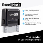 The perfect return address stamp or general use custom rubber stamp. Ideal for rapid and repetitive use, ExcelMark's self-inking stamps automatically re-ink by rotating into their ink pad.
