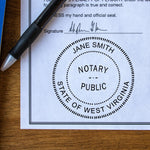 This West Virginia notary stamp for professional notaries creates a high quality seal impression using a round self-inking notary stamp. A self-inking notary stamp mount re-inks the rubber die into the self-contained ink pad before each impression, making it ideal for quick, repetitive stamping during those busy work days. Each side of your ExcelMark ink pad initially lasts for thousands of impressions and is simple to re-ink and replace. A clear base on the mount allows you to easily line up those impressions.