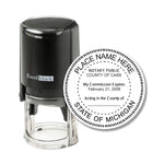 This Michigan notary stamp for professional notaries creates a high quality seal impression using a round self-inking notary stamp. A self-inking notary stamp mount re-inks the rubber die into the self-contained ink pad before each impression, making it ideal for quick, repetitive stamping during those busy work days. Each side of your ExcelMark ink pad initially lasts for thousands of impressions and is simple to re-ink and replace. A clear base on the mount allows you to easily line up those impressions.